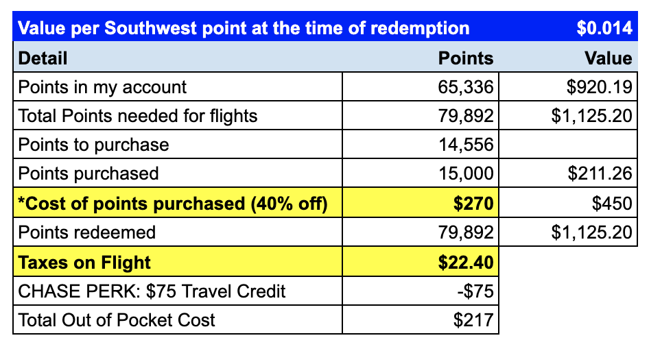 Southwest points are typically valued at 1.5 cents each, and I paid 1.8 cents each. Since I was short just a handful of points, I found it worth it in this case.